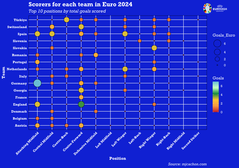 Well, we can see that it is fairly spread across almost all the teams, except for England and Germany, which have had strikers more focused on forward positions.