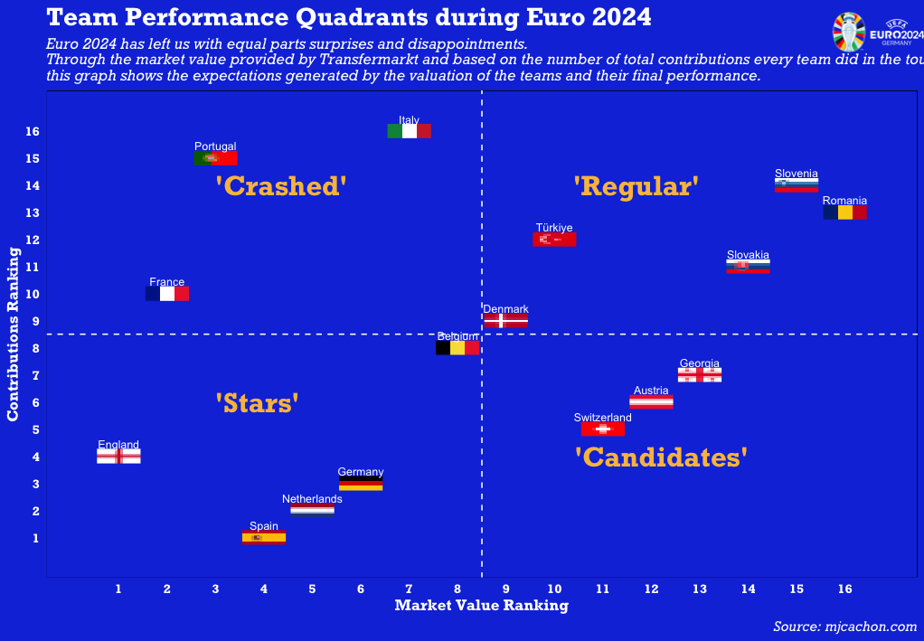 The quadrant chart shows the comparison of both rankings (valuation ranking and contribution ranking) to identify those who responded to market expectations as stars (star), those who could not transform their valuation into contributions (crashed) and those who are candidates to shine as stars, because their performance did so despite their valuation.
