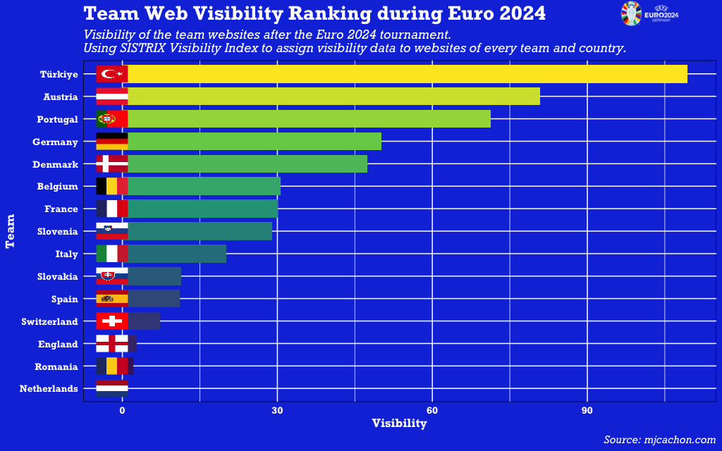 Using the industry standard SISTRIX tool with its Visibility Index metric, I have analysed the website of each country’s football federation to see what their organic performance is in their respective country.