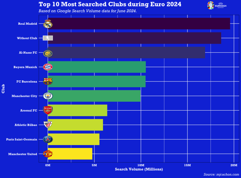 The same exercise can be carried out by grouping by the club of origin of each player, which leaves us with a curious fact: Real Madrid reaches almost 20 million searches and is followed by a group of players who are currently without a team, either because they are free agents who have not yet decided their destination (Memphis Depay), or because they are playing their last games as professionals (Toni Kroos).