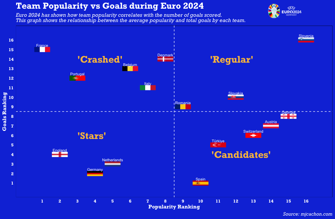 It is interesting to note that France, England, Portugal and Germany have generated the most searches on Google, however, only England and Germany have maintained the level of goals scored, at least.