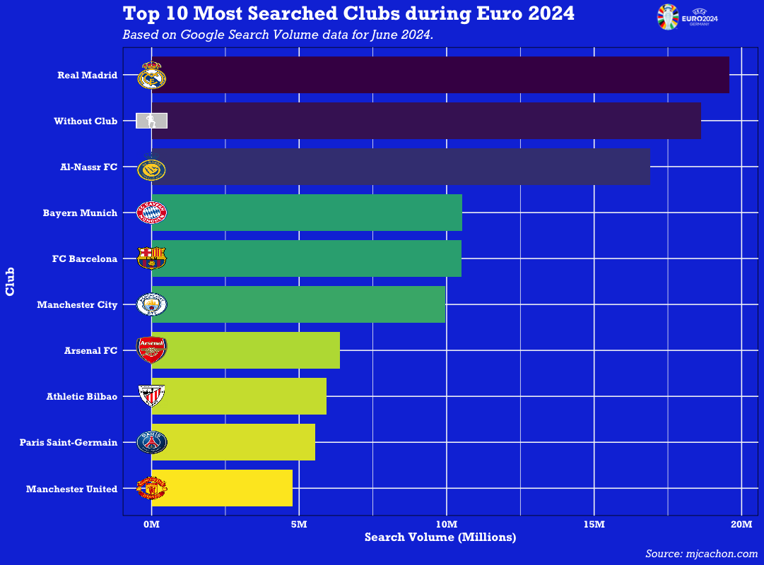 The same exercise can be carried out by grouping by the club of origin of each player, which leaves us with a curious fact: Real Madrid reaches almost 20 million searches and is followed by a group of players who are currently without a team, either because they are free agents who have not yet decided their destination (Memphis Depay), or because they are playing their last games as professionals (Toni Kroos).