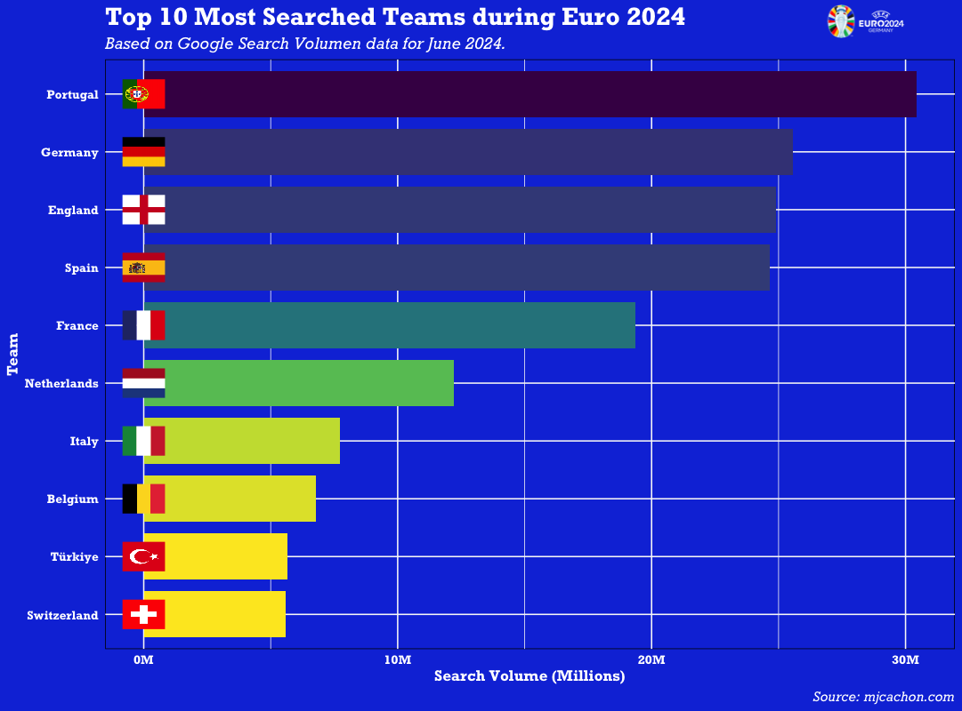 If we group the players Google search data by national team, we have clear winners, such as Portugal, which has more than 30 million searches in that period, Germany with more than 25 million and England and Spain, which are close to that figure.