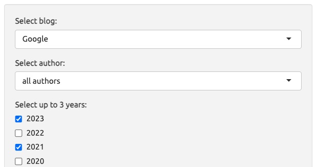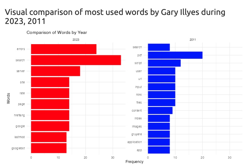 3) Using R and Shiny, I have been able to create a graph and some general or author tables, to know which words each person uses in each year. For example, what Gary Illyes wrote on the blog in 2023 vs. 2011. Quite interesting, right?
